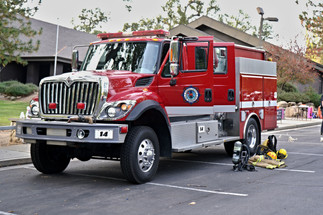 Over there a huge Caltrans fire truck is flashing red lights.